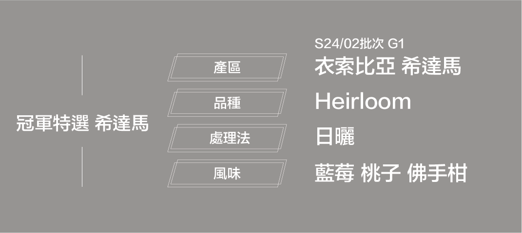 產區:世界冠軍Berg Wu冠軍特選系列 衣索比亞 希達馬 S24/02批次 G1